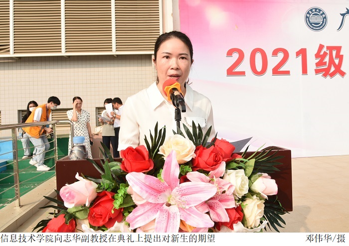 随后,教师代表、信息技术学院向志华副教授在大会上对新生提出三点期望:一是尽快适应大学的学习和生活环境。要学会独立自强,学会自己解决生活和学习中的各类难题,培养良好的自我管理能力,制定自己的学习计划和人生目标;二是做好规划,将有限的时间和精力以最大的效率投入到学习与实践中去,真正做到学以致用;三是学会承担责任,培养高尚的道德情操和顽强的意志品格,积极参加学校的各种文体活动,提升自身的人文素质和综合发展的能力。