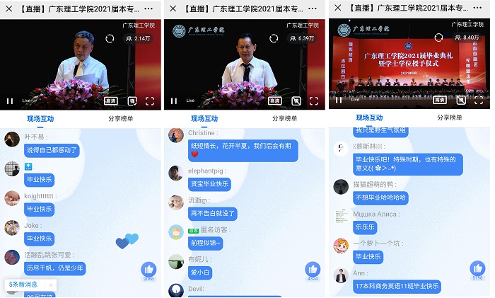 为做好疫情防控工作,典礼以线上线下相结合的方式举行,各院系主任、党总支书记、教师代表、毕业生代表等在现场观礼,其余师生、毕业生家长等在“云端”相聚,共同见证这一光荣、庄严的时刻。
