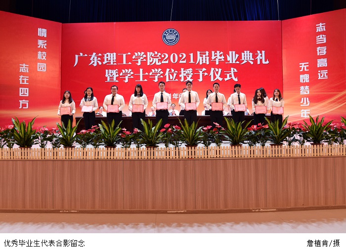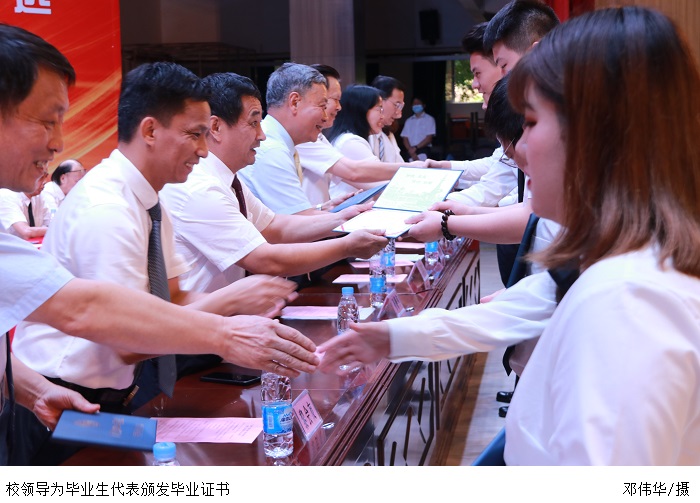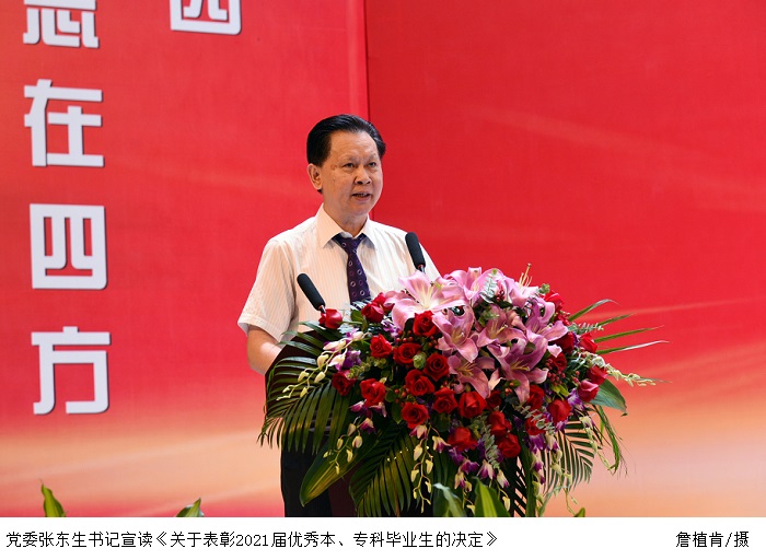 张东生书记宣读《关于表彰2021届优秀本、专科毕业生的决定》。主席台就座的领导为本科、专科优秀毕业生代表颁发 “荣誉证书”。