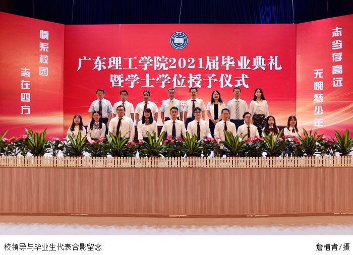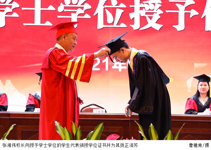 刘香萍副校长宣读《关于授予2021届本科毕业生学士学位的决定》。张湘伟校长向授予学士学位的学生代表颁授学位证书、为其拨正流苏,并合影留念。