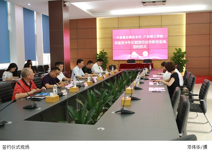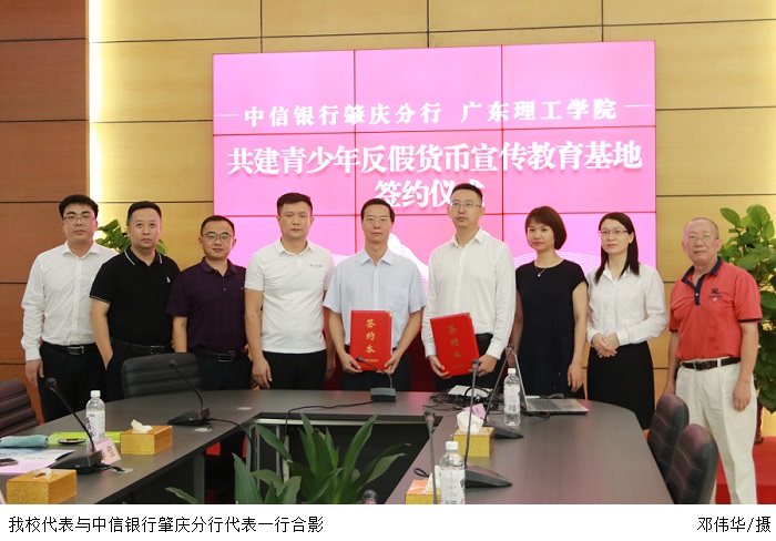 bat365官网副校长谭锦兴与中信银行肇庆分行营业部总经理罗栋签署合作协议,并为“肇庆市校园爱护人民币和反假货币宣传教育基地”揭牌。