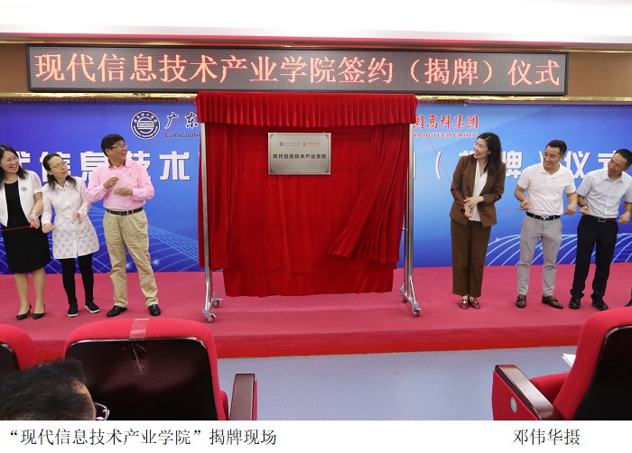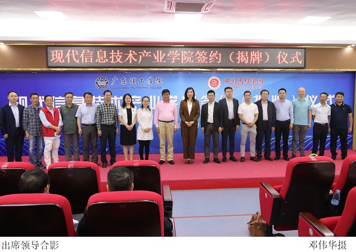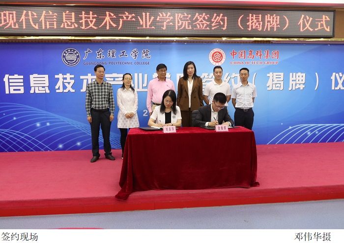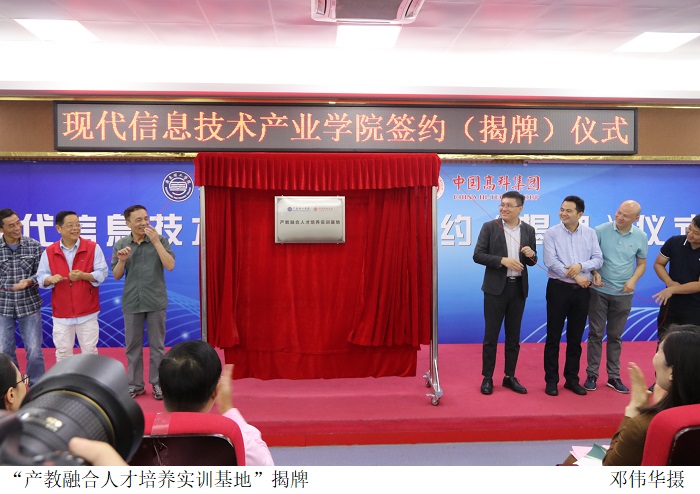 刘香萍副校长与中国高科集团股份有限公司徐俊辉先生代表双方签署“共建现代信息技术产业学院”项目合作协议。随后,双方代表分别为“现代信息技术产业学院”、 “产教融合人才培养实训基地”揭牌。