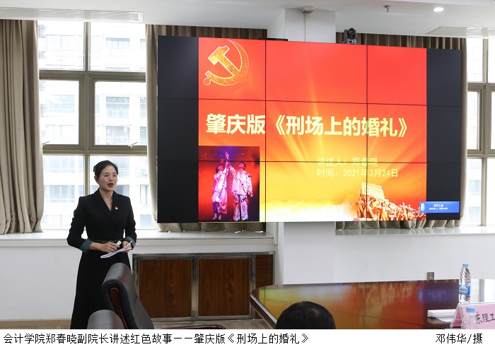 会计学院副院长、教师党支部书记郑春晓慷慨激昂讲述红色故事——肇庆版《刑场上的婚礼》,主人公植启芬、邓偶娟坚信党能带领人民走上辉煌道路,义无反顾地为党的发展奉献出自己宝贵的生命。郑副院长表示,缅怀先烈是为了汲取力量,回顾历史是为了继续前进。我们应当常怀感恩之心与感激之情,更有责任有动力珍惜当下,不忘初心、牢记使命,秉承先烈的革命理想夙愿,为中华复兴奋斗余生。