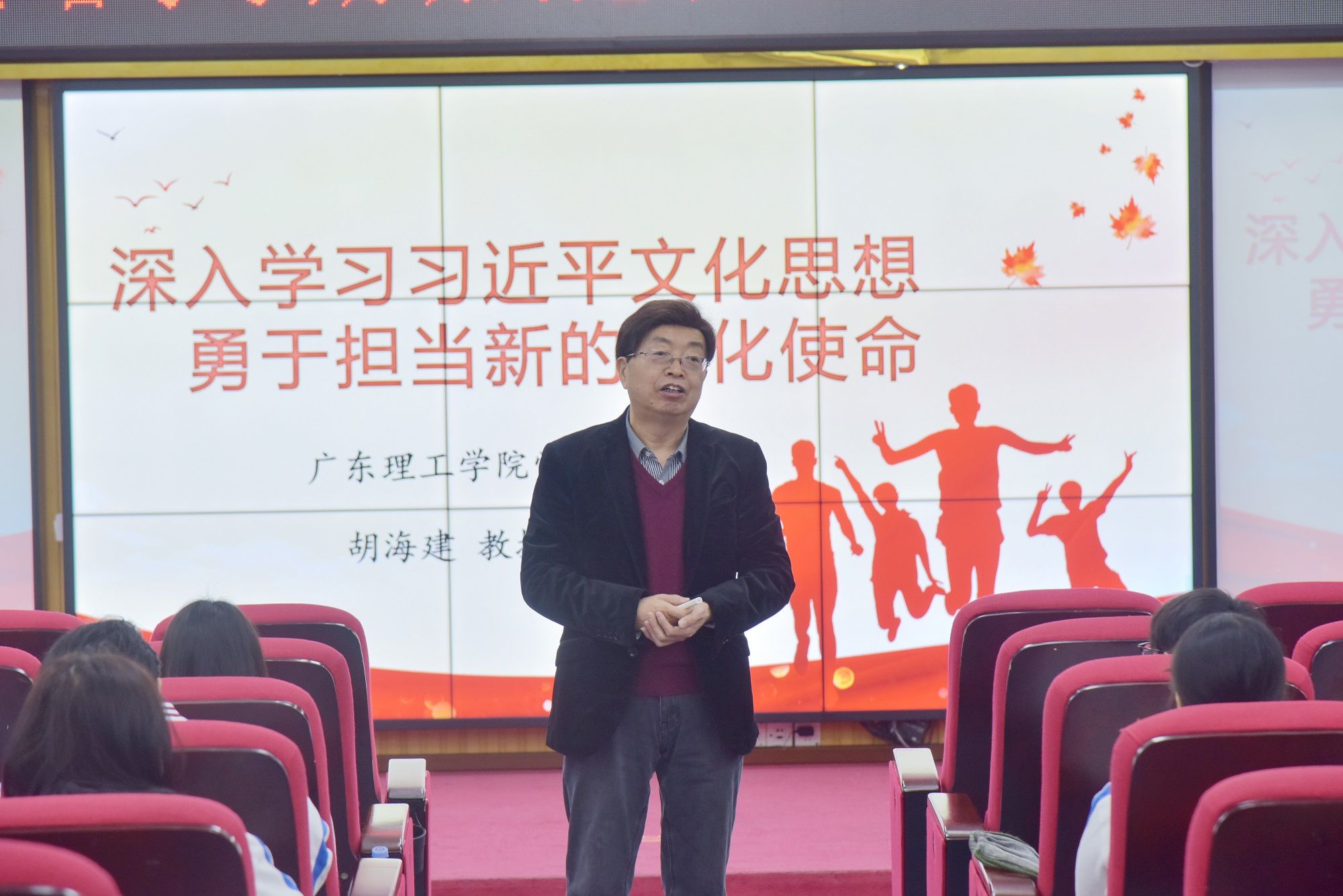 胡海建以“深入学习习近平文化思想,勇于担当新的文化使命”为主题,运用大量贴近生活的案例,深入浅出地讲解了习近平文化思想的形成过程、核心理念、实践意义以及bat365官网对习近平文化思想的践行成果等。他强调,中华优秀传统文化是中华民族的根和魂,文化自信是更基础、更广泛、更深厚的自信。他指出,学校始终坚持将培养具有良好道德品质、有社会责任感和较强创新精神,专业基础扎实,实践能力突出,综合素质高,德智体美劳全面发展的应用型人才作为人才培养的目标定位,在课内外加强对青年大学生的技能培育、人格培养和思想引领。同时,他展示了学校毕业学子张真源、梁自军等优秀学子践行初心使命,反哺社会的案例,希冀同学们向优秀师兄师姐们学习。他寄语同学们,要深刻领会习近平文化思想的丰富内涵、核心要义和实践要求,增强文化自觉与文化自信,牢记嘱托、砥砺前行,不断厚植家国情怀,涵养进取品格,励志担当大任,积极投身中国式现代化的广东实践,把个人发展融入民族复兴的伟大事业中。