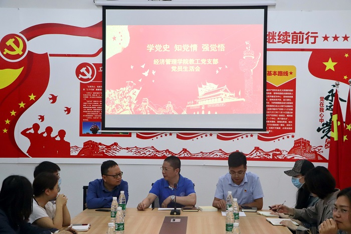 本网讯(经济管理学院)为庆祝中国共产党成立100周年,深入学习贯彻习近平总书记在党史学习教育动员大会的重要讲话精神,紧密结合工作实际,4月20日下午,经济管理学院于4103会议室召开党员教职工“学党史、知党情、强觉悟”党史学习会,经济管理学院党总支甘怀南书记、吴楚升副书记、教工党支部李博副书记及经济管理学院全体党员教职工共同参会学习。