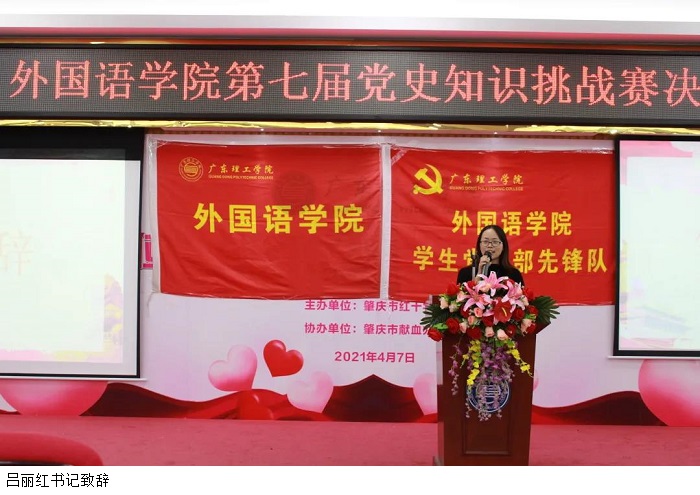 吕丽红书记为本次比赛致辞。她代表外国语学院党总支向莅临本次比赛现场的各位领导、各位同学表示最热烈的欢迎,并向各位晋级到决赛的选手表示衷心的祝贺。吕书记表示,希望通过这次比赛,充分调动全体学生的自觉性和积极性,并把相对枯燥的理论知识和活泼的比赛形式结合起来,使大家在积极参与的过程中不断巩固学习成果,更加深入人心。其次,吕书记鼓励全体同学忆党史、铭党恩、强党性、促党建、肃党纪、正党风,开展党史、党纪、党规以及相关知识教育,掀开党史的知识学习新潮。以赛促学,进一步继承和发扬党的优良传统,体现组织先进性和凝聚力,进一步展示党建工作特色和亮点,并积极鼓励同学们去把握时代脉搏,高扛党旗,勇做时代新人。