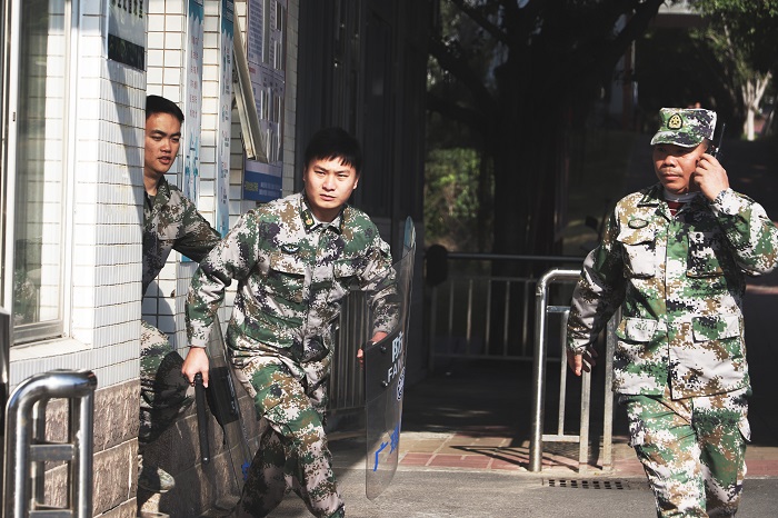本网讯(校报记者 陈怡颖/黄欣怡/刘学宝/吴自献/林土坤)为了增强安保人员反恐防暴安全意识,确保师生生命安全,做好校园安全保卫工作,建设安全校园。12月31日下午,bat365官网于学校正门开展反恐应急演练。本次演练由bat365官网保卫处干事、校警协同肇庆市公安局高要分局莲塘派出所开展,保卫处处长曾荫初进行现场指导。