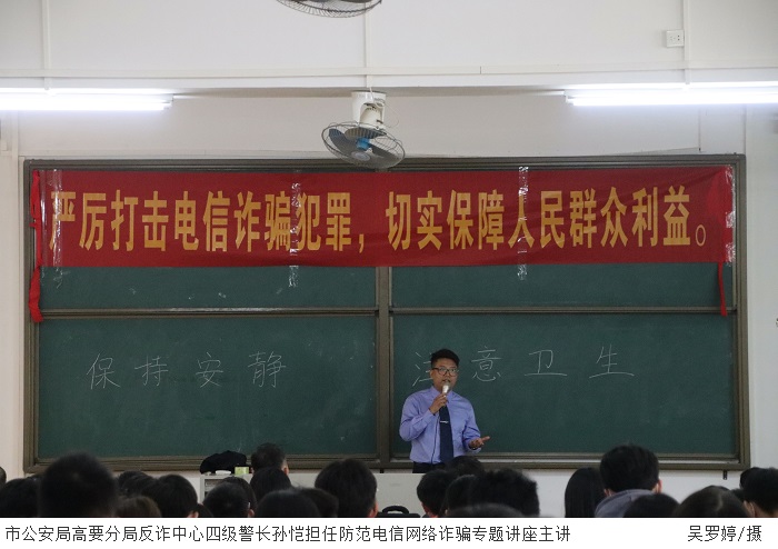 孙恺警官阐述了电信网络诈骗的定义、种类、形式和防范措施,以实际案例分析了网络电信诈骗的严重危害性,并着重介绍了冒充公检法人员、网络刷单、网络贷款诈骗、网购游戏币诈骗、冒充熟人诈骗等几种常见的诈骗手法。他强调,近年来电信诈骗的形式越发多样化,高校更是电信诈骗的高发地区,希望同学们提高防范意识,牢记“六个一律,八个凡是。”同时,在遭遇网络电信诈骗时不要慌张,及时报警止损。