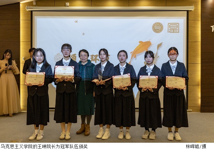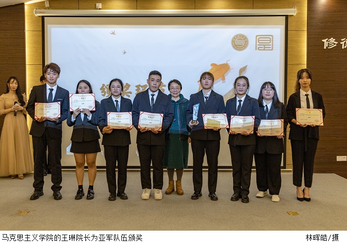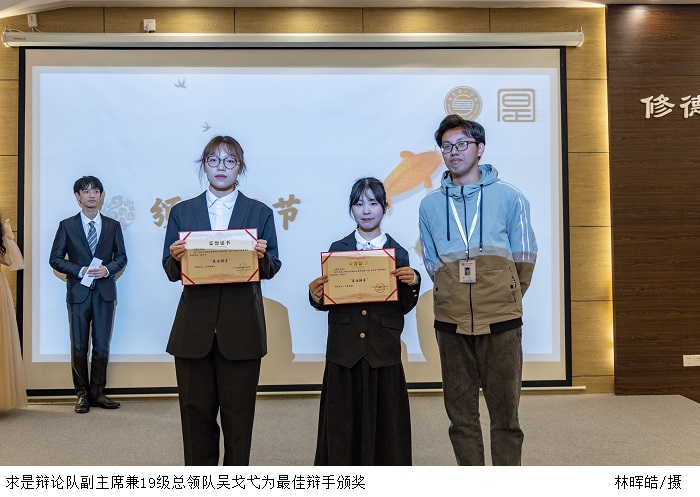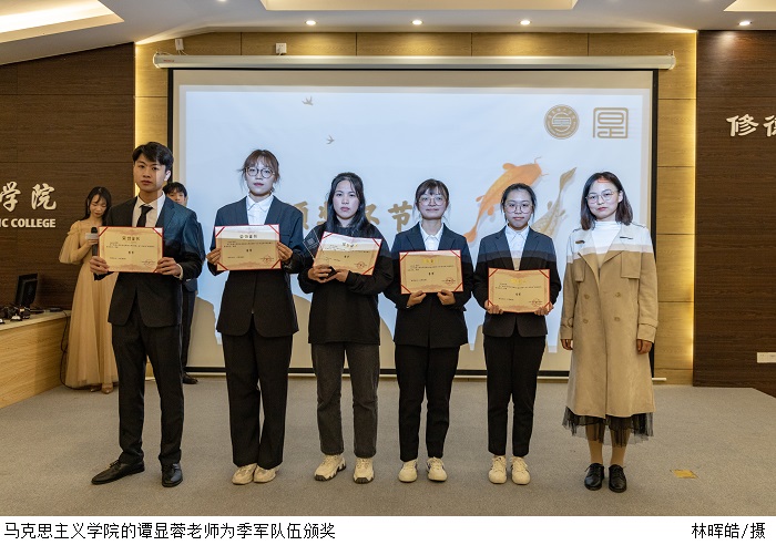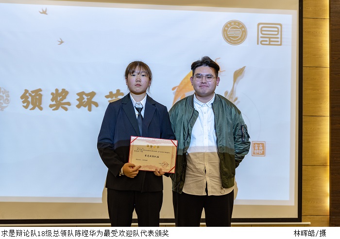 评委老师分别对两场辩论进行了点评。经过一番激烈的角逐,冠军队伍是“里约热内卢的榴莲牛奶”队,亚军是“夺冠小分队”;季军是“对方辩友你不对我”队;优秀奖是“刘奶奶找牛奶奶买牛奶”队;最受欢迎队是“夺冠小分队”;最佳辩手由刘楚悦、张翠莹获得。以上获奖人员由王琳院长、谭显蓉老师、张德华老师、求是辩论队18级总领队陈铿华以及求是辩论队副主席兼19级总领队吴戈弋分别颁奖。