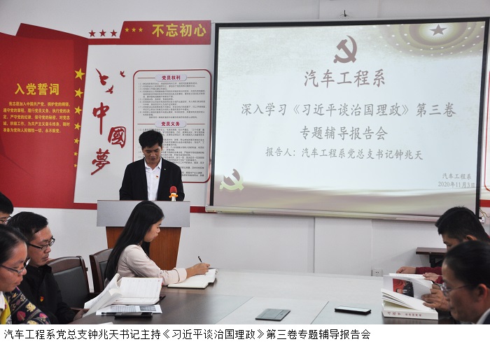 本网讯(汽车工程系)为深入学习《习近平谈治国理政》第三卷,进一步统一认识、明确方向,坚持党中央权威和统一领导, 113日,汽车工程系党总支在7303会议室召开深入学习《习近平谈治国理政》第三卷专题辅导报告会。本次专题辅导报告会由汽车工程系党总支钟兆天书记主持,全体教工党员参加。