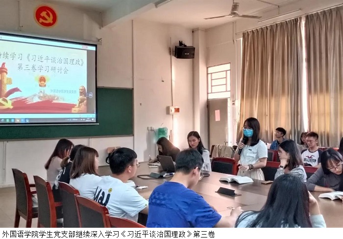 本网讯(外国语学院新闻中心)116日下午,外国语学院学生党支部开展党员学习研讨会,继续深入学习《习近平谈治国理政》第三卷。本次学习研讨会由学生党员李春婷同志主持。