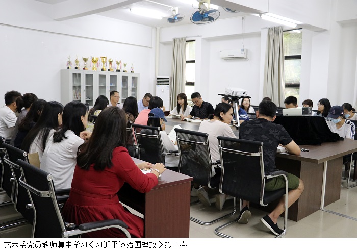 本网讯(艺术系 熊祝浩)9月15日下午,艺术系党员教师于艺术楼201会议室,集中学习了《习近平谈治国理政》第三卷。艺术系党总支书记赵宁、副书记花仕旺和全体党员老师出席本次会议。