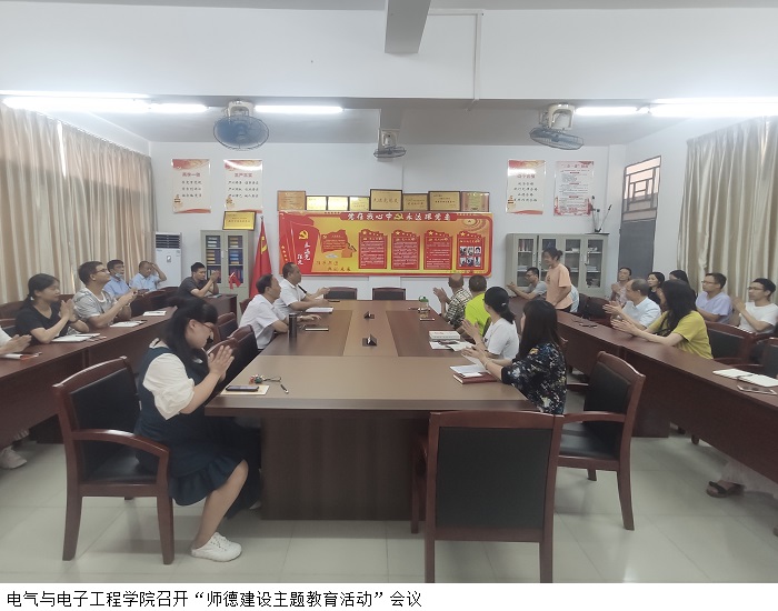 本网讯(电气与电子工程学院)为了响应广东省教育厅《关于开展2020年师德建设主题教育月活动的通知》要求,进一步加强我院师德师风建设,全面提升教师思想政治素质和职业道德水平。9月22日下午,电气与电子工程学院在7栋203室召开“师德建设主题教育活动”会议,会议由党总支书记陈文华主持,电气学院院长关键及电气学院全体教师参会。