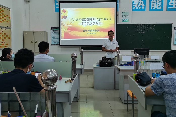 本网讯(会计学院 新闻中心) 9月8日下午,会计学院党总支在7栋112举行了《习近平谈治国理政》第三卷学习暨党员转正会议。党总支黎伯毅书记主持会发表重要讲话。