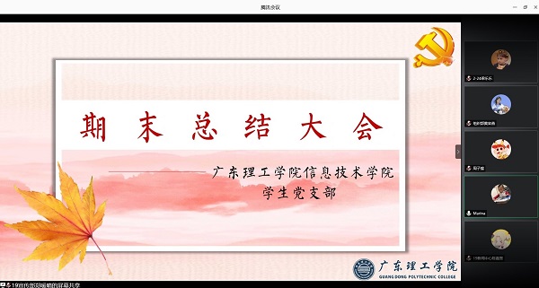 本网讯(信息技术学院 李章慧)711日上午,信息技术学院学生党支部于线上举行期末总结大会。信息技术学院党总支梁星全书记、学生党支部书记胡娇铃老师以及我院学生党支部的全体人员参加大会。