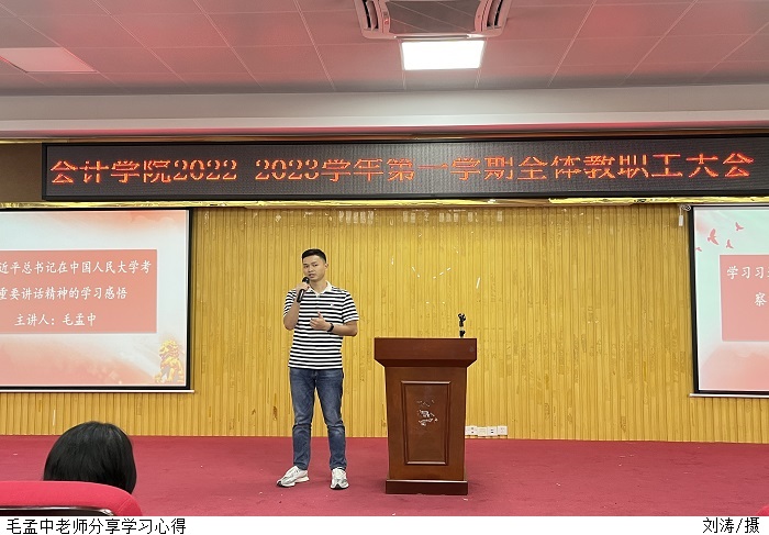 毛孟中老师结合自身经历,分享了关于“学习习近平总书记在中国人民大学考察时的重要讲话精神”的学习感悟,田莹莹老师针对“论学习贯彻习近平总书记在庆祝中国共产党成立一百周年大会上重要讲话”分享了学习体会和自身感悟。