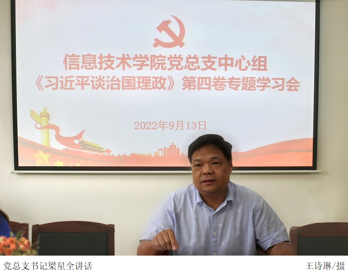 本网讯(信息技术学院 李伟发、王诗琳)为深入贯彻党委关于认真开展《习近平谈治国理政》第四卷学习宣传贯彻工作的通知精神,9月13日下午,信息技术学院党总支中心组于振华楼203室召开了《习近平谈治国理政》第四卷专题学习会,会议由信息技术学院党总支书记梁星全主持,信息技术学院理论学习中心组全体成员参会。