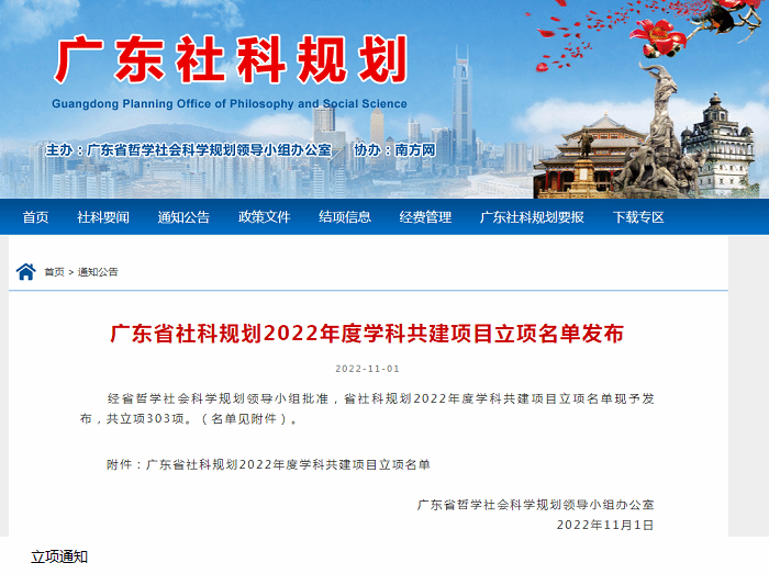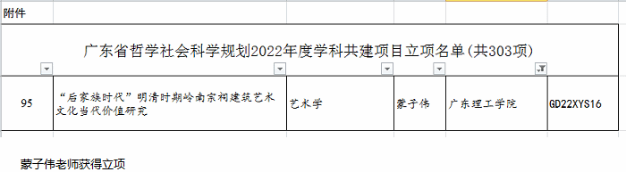 本网讯(科技处 刘霞)近日,广东省哲学社会科学规划领导小组办公室发布了广东省哲学社会科学规划2022年度学科共建项目立项名单,2022年度全省共立项303项,bat365官网蒙子伟老师申报的《“后家族时代”明清时期岭南宗祠建筑艺术文化当代价值研究》项目成功立项,单项项目获得资助经费4万元。