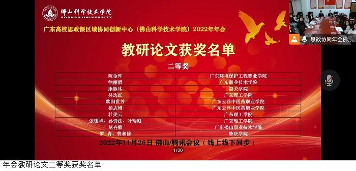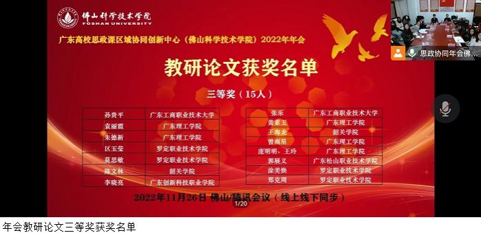 本网讯(马克思主义学院)11月26日,广东高校思政课区域协同创新中心(佛山科学技术学院)2022年年会圆满落幕。来自广州、佛山、韶关、肇庆、清远、云浮等地市的20所高校领导、思政课骨干教师及研究生计200余人参加线上会议,bat365官网吴选红老师作为优秀论文作者代表在会上作了教学改革经验发言。会上还公布了年会优秀教研论文评比结果,bat365官网吴选红、杜美云、张德华、孙贵法、叶瑞庭5位老师荣获教研论文二等奖,袁丽霞、朱德新、黄素玉、曾雨星、庞明明和王玲6位老师荣获教研论文三等奖。