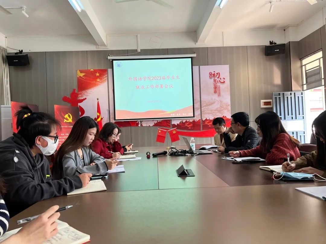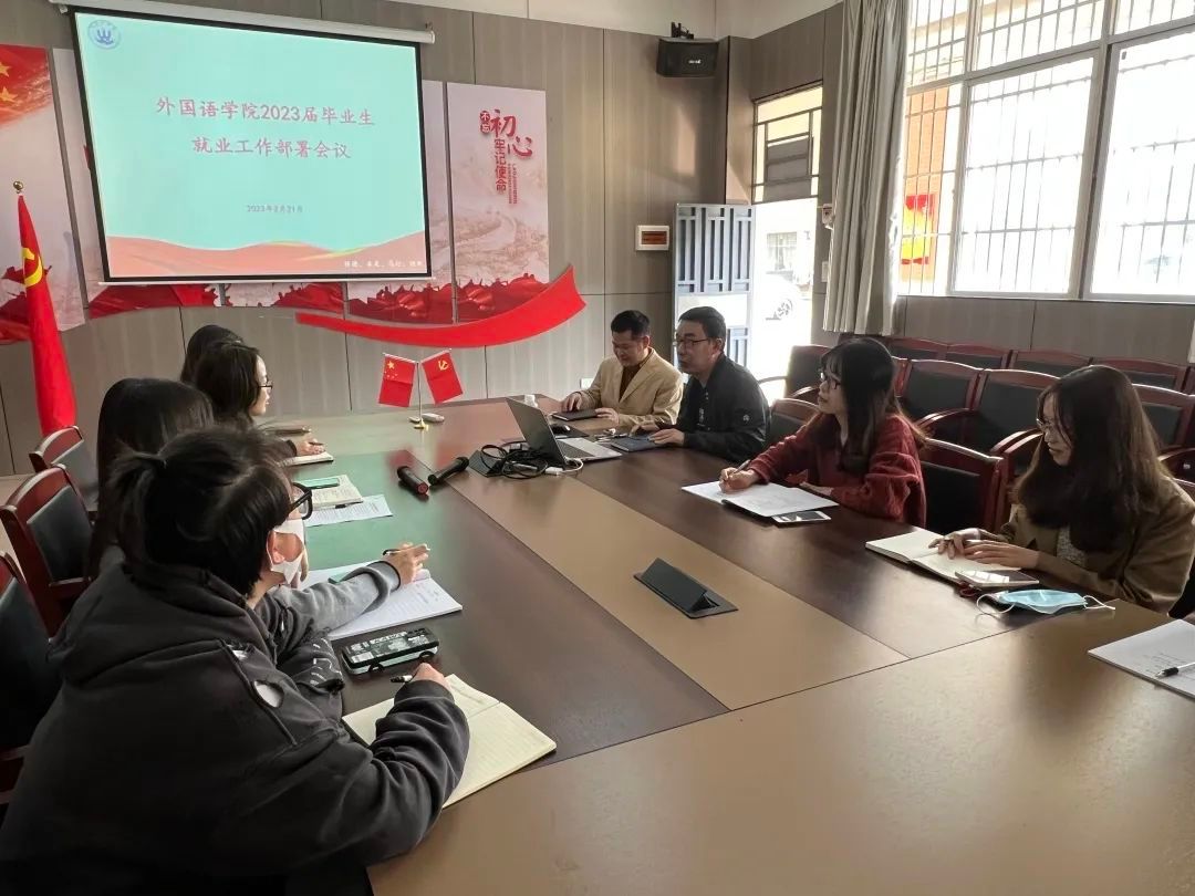 本网讯(外国语学院新闻中心)为推动2023届毕业生就业相关工作平稳有序开展,2月20日下午,外国语学院党总支吕丽红书记主持召开2023届毕业生就业工作部署会议,吕媛副书记及全体毕业班辅导员参会。学校就业指导中心钟培荣、丁明建老师出席本次会议,共同研讨就业工作的重点难点,为就业工作提供指导和帮助。