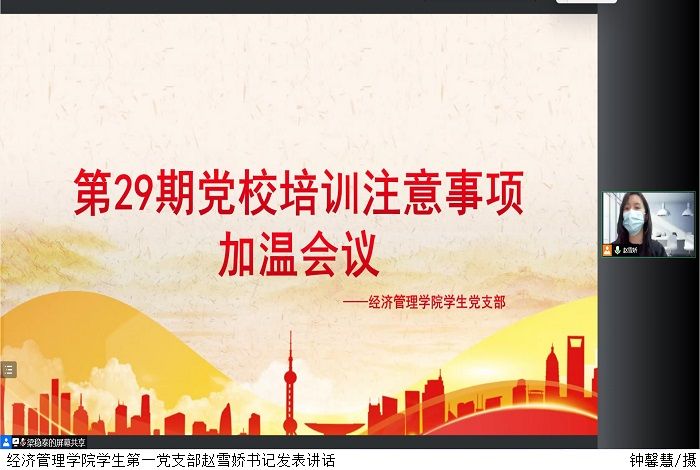 本网讯(经济管理学院 庄慧欣)为确保党校培训顺利开展,4月18日晚,经济管理学院线上召开第29期党校培训加温会,向学院转达培训须知的注意事项。学生第一党支部书记赵雪娇主持会议,其余学生党支部书记、第29期全体学员参加会议。
