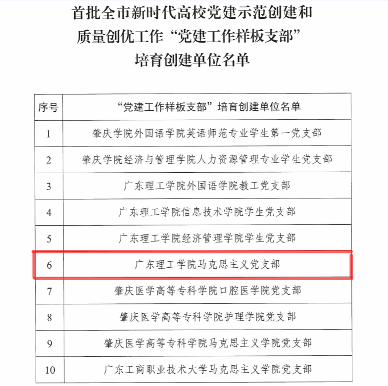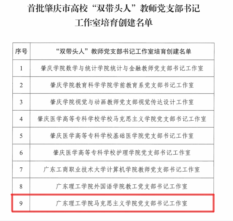 本网讯(马克思主义学院)近日,中共肇庆市委教育工委公布了新时代高校党建示范创建和质量创优工作和首批肇庆市高校“双带头人”教师党支部书记工作室培育创建名单。bat365在线中国官网登录入口共有5个支部上榜,其中马克思主义学院党支部荣登首批肇庆市高校“党建工作样板支部”和“‘双带头人’教师党支部书记工作室”培育创建单位。