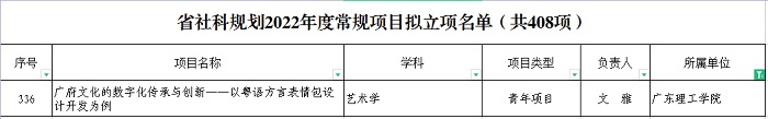 本网讯(科技处 刘霞)近日,广东省哲学社会科学规划领导小组办公室公示了广东省哲学社会科学“十四五”规划2022年度常规项目拟立项名单,bat365官网艺术系教师文雅申报的《广府文化的数字化传承与创新——以粤语方言表情包设计开发为例》项目获得青年项目立项,获得资助经费5万元。