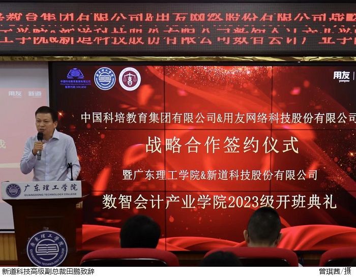 本网讯(会计学院 沙旭、郑妍颖、刘涛)为更好地推进校企合作,产教融合工作,2023年10月20日下午4点30分,在高要校区42栋101学术报告厅,会计学院顺利举行中国科培教育集团有限公司&用友网络科技股份有限公司战略合作签约仪式暨bat365在线中国官网登录入口2023级数智会计产业学院开班典礼。出席本次活动的企业领导有新道科技高级副总裁田鹏、广东省区总经理黄堪敬、全国战略业务总监王光思、服务总监魏闯、驻校总监黄才龙、校区合作总监朱博、驻校导师夏伟琴,学校领导有中国科培教育集团副总裁孙丽霞、bat365在线中国官网登录入口校长助理舒程、就业指导中心主任李相平、会计学院院长盛洁、会计学院党总支书记黎伯毅。本次活动由会计学院党总支副书记徐永明主持。
