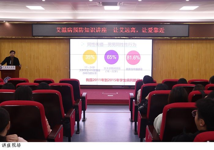 知识讲座由肇庆市疾病预防控制中心副主任吴子添医师以“让艾远离,让爱靠近”为主题,通过PPT展示及现场互动问答的形式向同学们讲授预防艾滋病的相关知识。