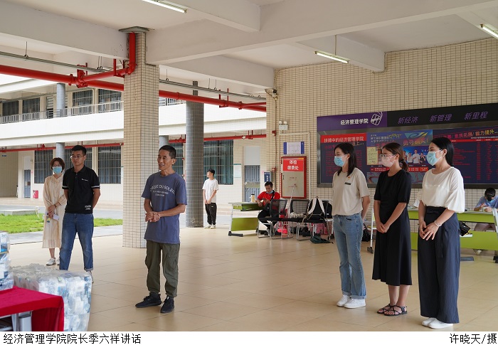 吴楚升介绍了政府和学校的资助政策。随后,老师为经管困难学子发放中秋应节物品、生活日用品等暖心物资。