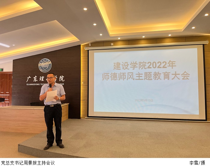 本网讯(建设学院 李雪)为了落实立德树人根本任务,进一步加强新时代师德师风建设,提升教师的职业道德素养,9月13日下午,建设学院在行政楼学术报告厅召开2022年师德师风主题教育大会,本次会议由党总支书记周景报主持,全体教职工出席会议。
