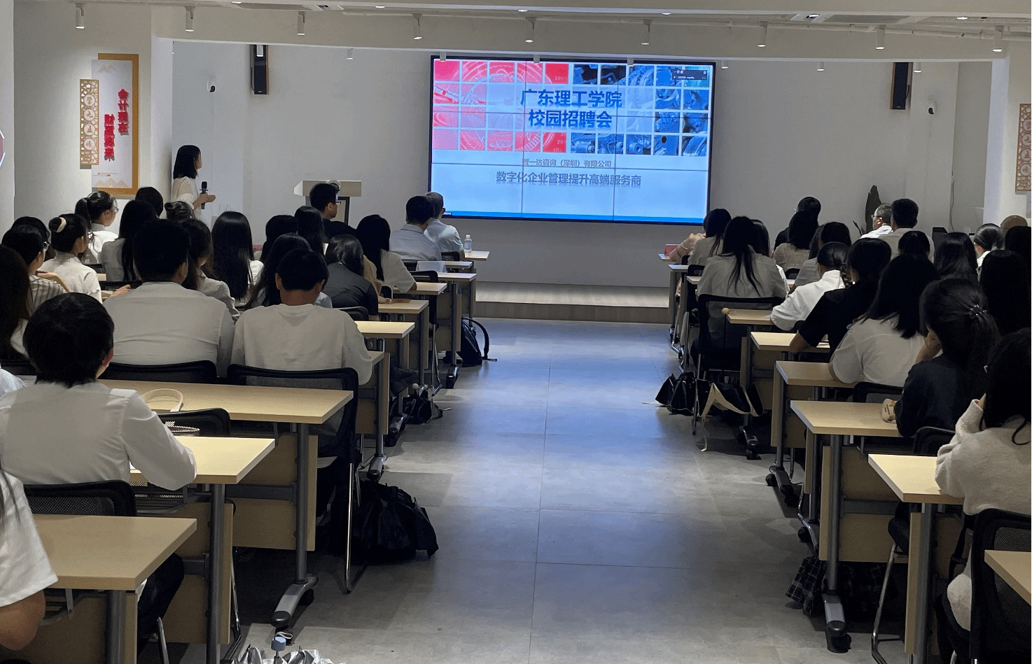 上海管易云计算软件有限公司、广州鹏远信息科技有限公司、佛山市行云管理软件有限公司、长沙惠邦网络科技有限公司四家企业依次线下宣讲。智一达咨询(深圳)有限公司等八家企业通过腾讯会议依次在线宣讲。宣讲会现场气氛热烈,并分区域组织了企业现场面试。金蝶实习班的学生积极踊跃地投递简历并与企业嘉宾现场沟通交流。