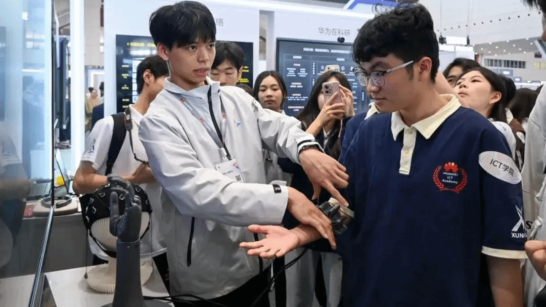随后,研学团来到华为脑机接口专区,探索华为脑机接口独角兽用意念控制未来的奥秘。bat365官网研学团成员何柏雨亲身体验了华为脑机接口设备的演示,对只需“想一想”就能操控设备完成指令的神奇功能惊叹不已。他感慨道:“这次大会让我深刻认识到,脑机接口技术不仅是科技领域的重大突破,更是人类与机器融合的新开端。”
