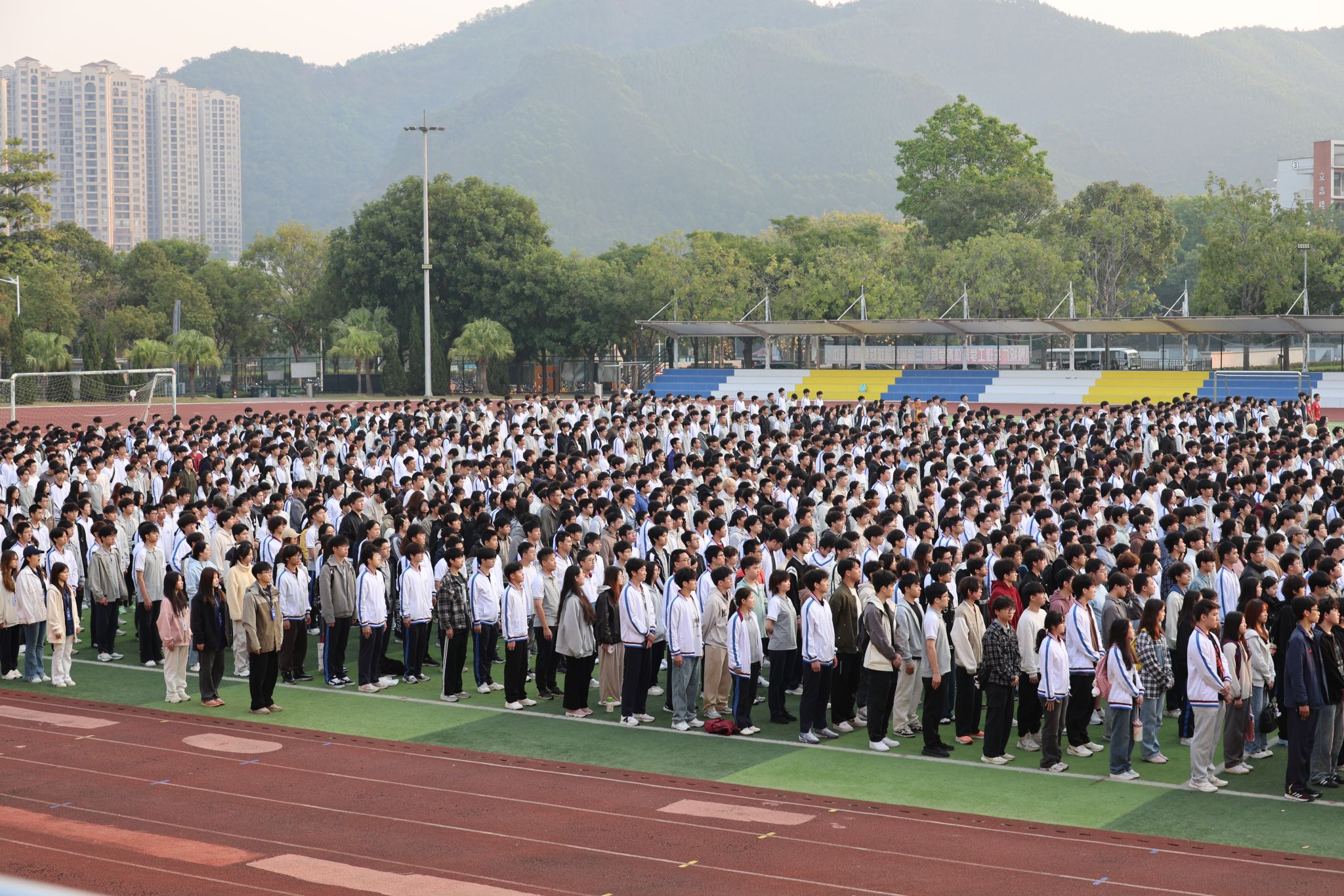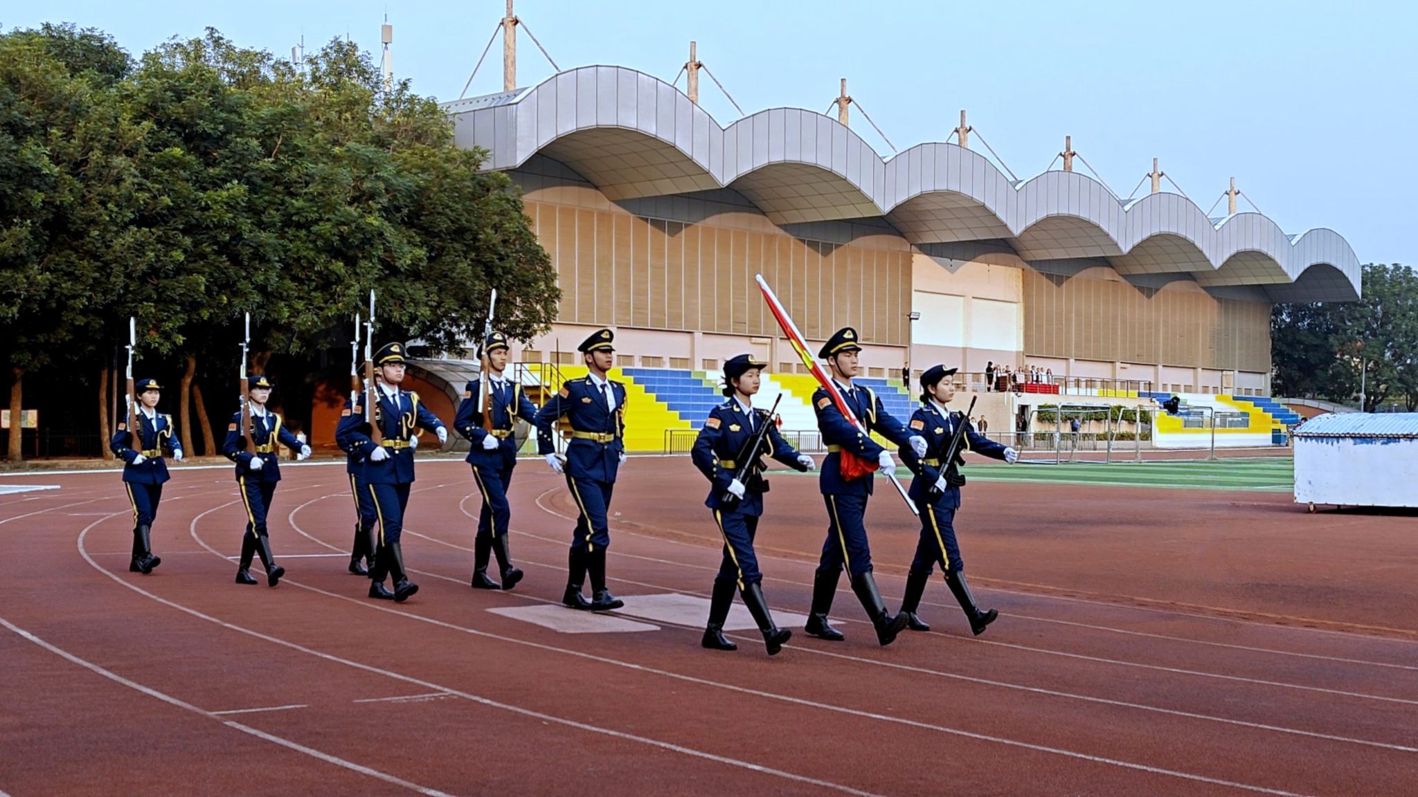 在全体师生的注目礼下,国旗护卫队踏着铿锵有力的步伐护送国旗入场,伴随着庄严的中华人民共和国国歌,五星红旗冉冉升起,迎风飘扬。师生们齐声高唱并行注目礼,传递着对祖国的无限热爱和崇高敬意。