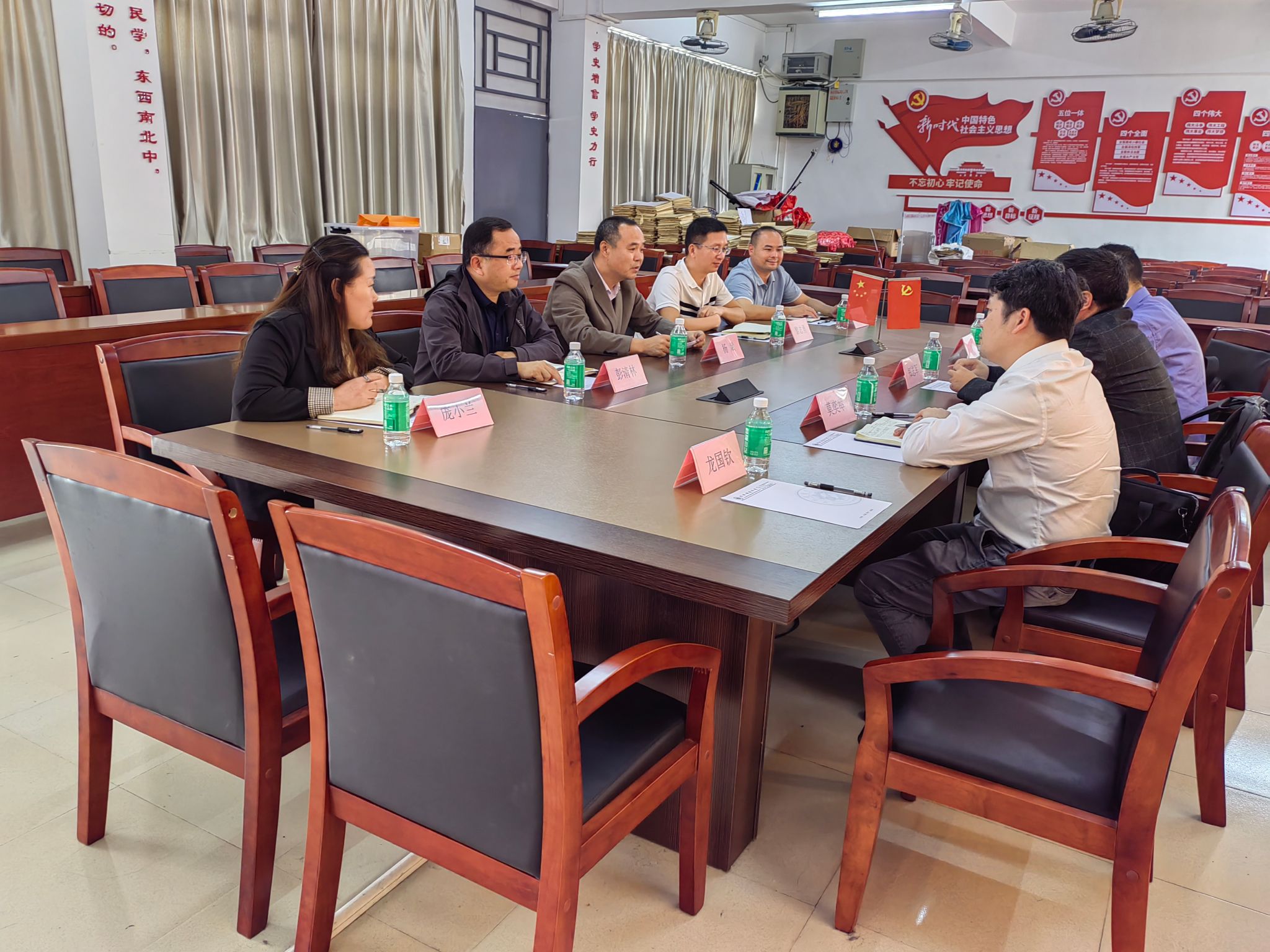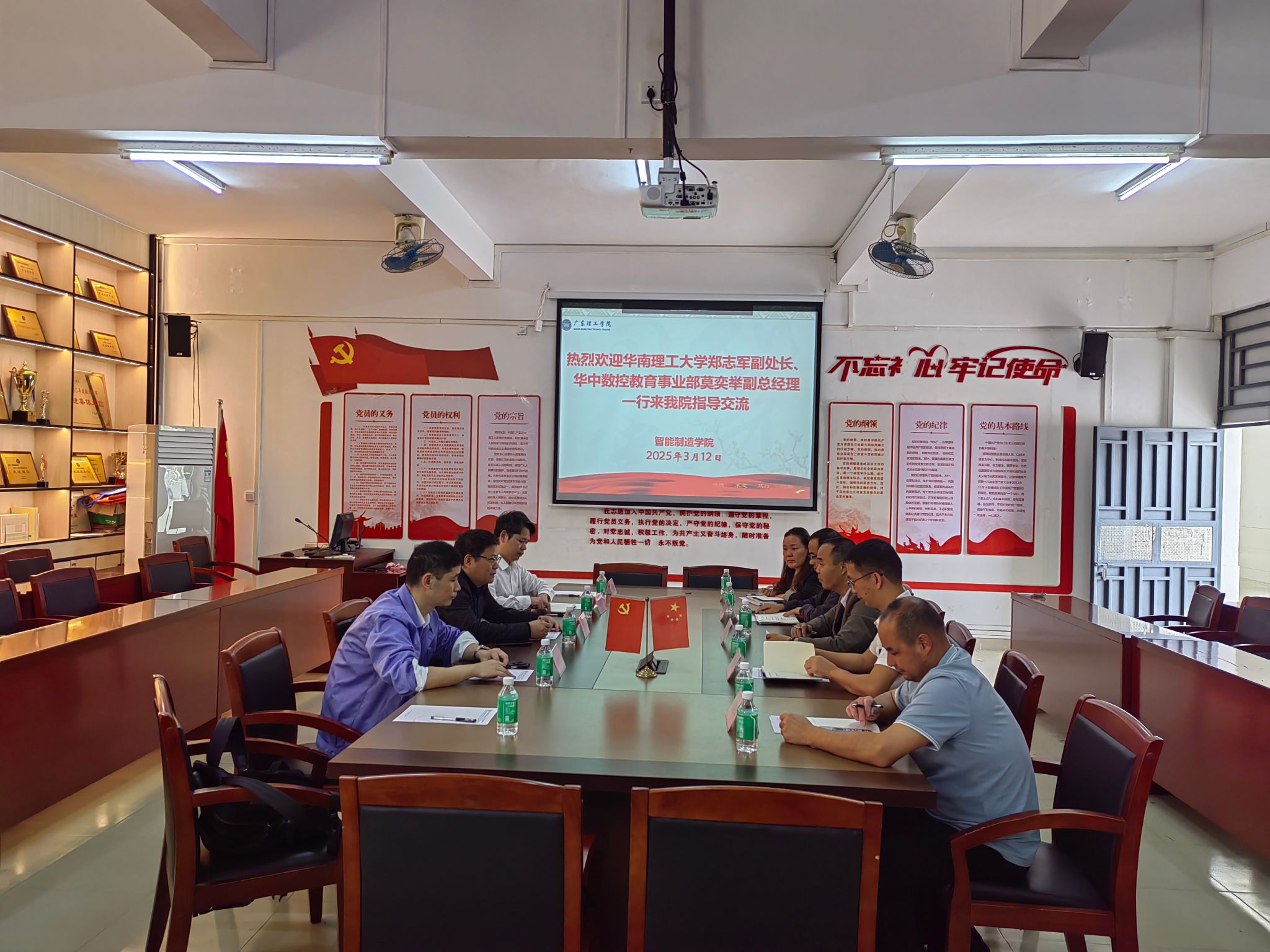 本网讯 3月12日上午10时,全国三维数字化创新设计大赛“华中数控杯”工业协作机器人及数字孪生技术创新应用专项赛(粤港澳大湾区赛区)合作交流会在bat365在线中国官网登录入口9栋304会议室举行。bat365在线中国官网登录入口智能制造学院院长杨斌、党总支书记彭清林、副院长黎志勇、庞小兰及党总支副书记苏庚华出席会议。华南理工大学设备处副处长、粤港澳大湾区大赛组委会主任郑志军,武汉华中数控教育事业部副总经理莫奕举、部长刘小平、区域经理龙国钦等嘉宾参与交流。