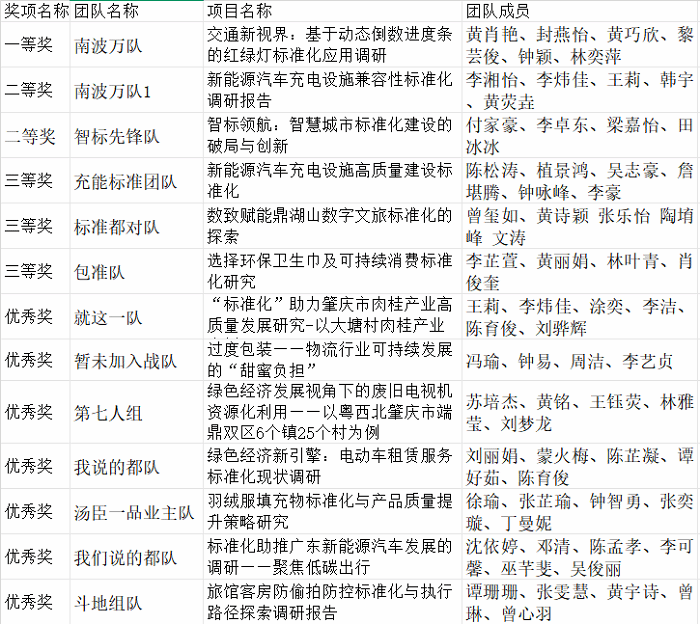 本次大赛分别由标准化工程专业带头人魏嫚教授、肇庆市粤科标准化研究院陈鸿韬院长、标准化工程教研室陈晓黎主任、广州南沙明曦检测服务有限公司陈慧冰总经理、广东高登铝业有限公司科技项目部梁小霞主任担任评委。同时,经济管理学院赵燕院长、广东生态工程职业学院绿美城乡产业学院赖秋红院长、广东省风景园林与生态景观协会陈艳华秘书长作为嘉宾莅临本次大赛。