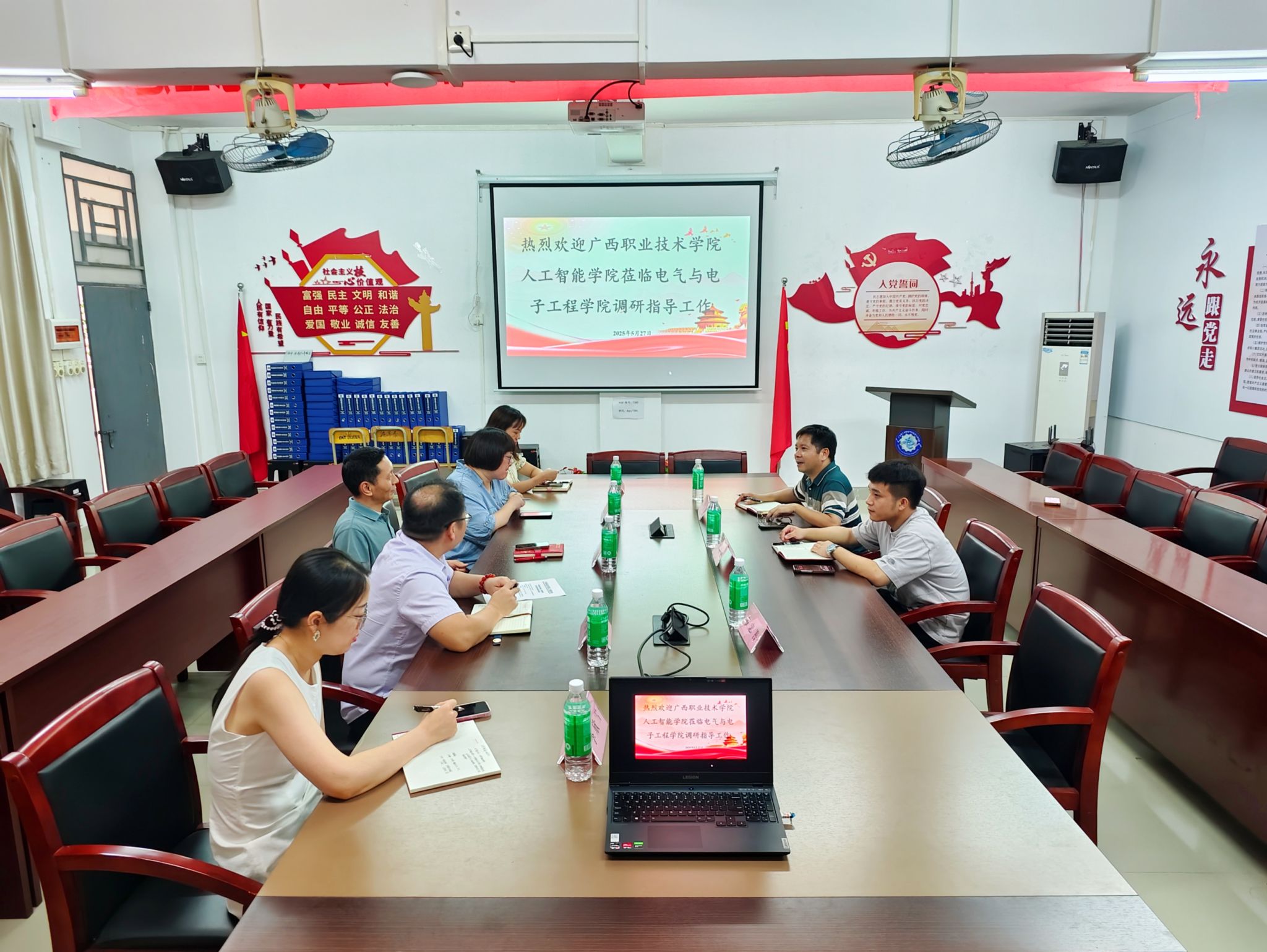 本网讯(电气与电子工程学院融媒体中心 杨捷稀)为深化院校合作、推动电子信息类专业建设升级,2025年5月27日下午,广西职业技术学院人工智能学院卢善勇等一行到访我院调研。我院在7栋203室热情接待来访人员,院长倪元相、副院长罗泽鹏、陈新欣及相关教研室负责人参与座谈,双方围绕岗位需求对接、职教本科人才培养模式创新、教学团队建设与资源开发等议题展开交流。