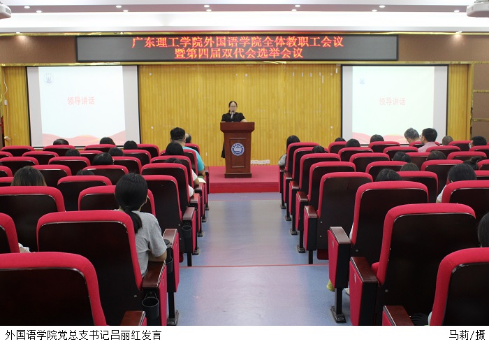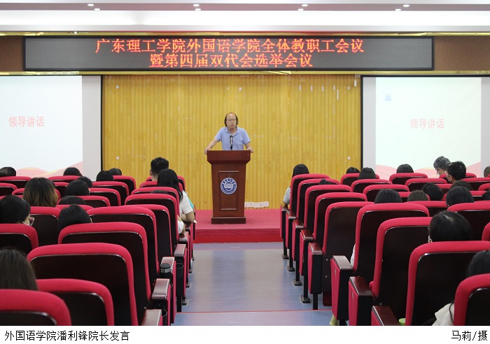 本网讯(外国语学院 唐跃华/马莉)外国语学院于5月31日下午在42101学术报告厅召开全体教职工会议暨第四届“双代会”选举会,重点总结外国语学院本学年工作情况,进一步推进各项工作有序开展,落实bat365在线中国官网登录入口第四届“双代会”代表选举工作。本次会议由党总支副书记吕媛主持。院长潘利锋、党总支书记吕丽红、副院长郑建蓉、副院长王泽熙出席会议,外国语学院全体教职工参会。