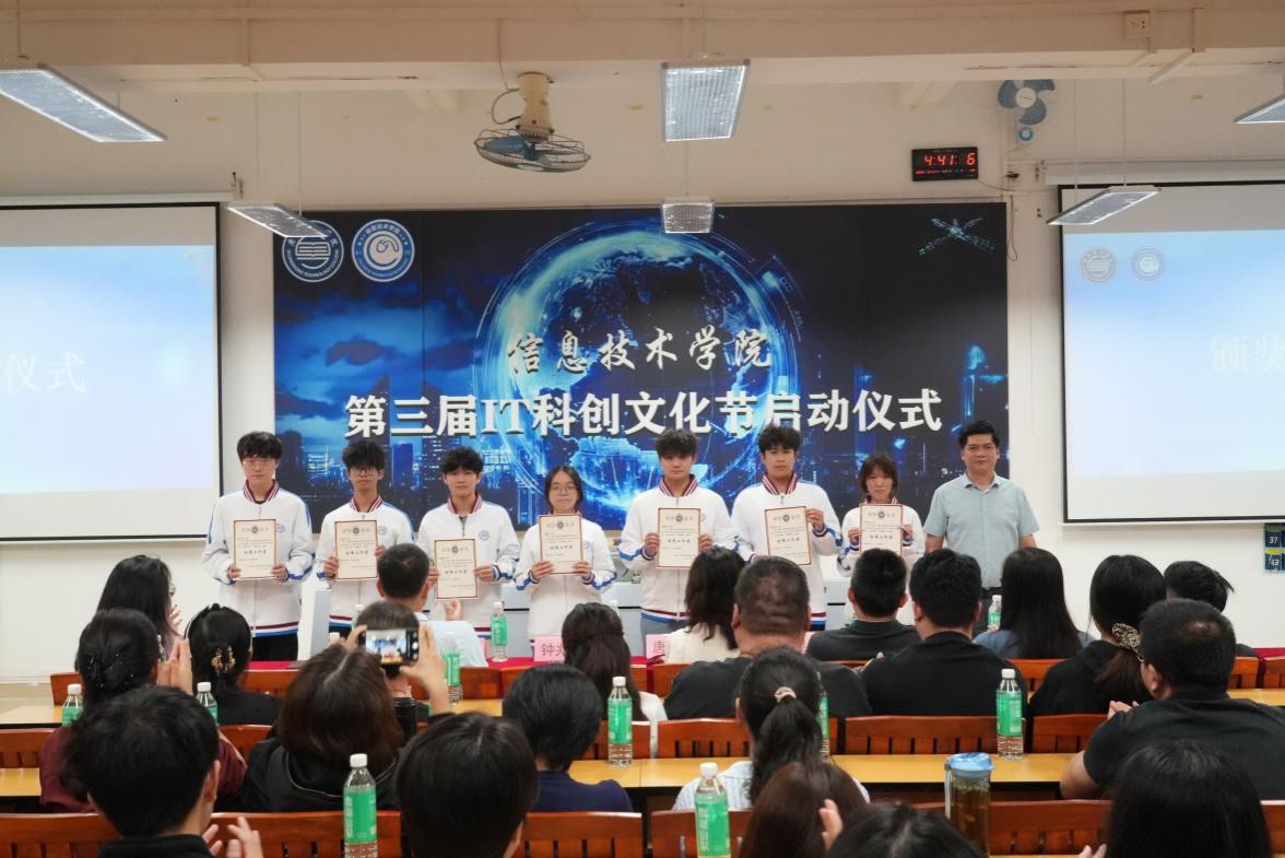 接着,现场表彰信息技术学院第二届IT科创文化节七名优秀工作人员,信息技术学院党委书记钟兆天为其颁奖并肯定他们在过往工作中的责任与担当。