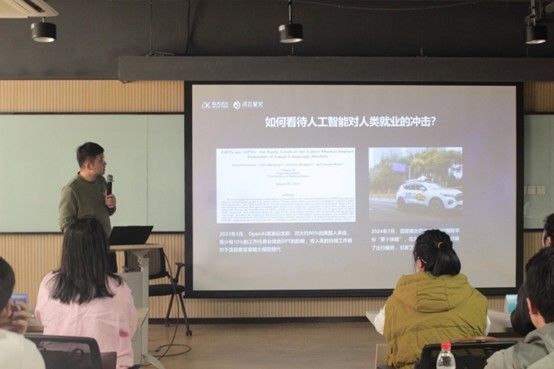 在讲座上,高级人工智能工程师朱吉光结合自身经验,以计算机领域未来发展方向,引导同学们对未来就业发展的思考。本次讲座围绕人工智能展开,涵盖其历经四次浪潮的发展历程,运算、感知、认知三大前沿智能技术,讯飞慧文、星火系列工具等相关产品及多领域应用,探讨了人工智能对常规重复性工作的替代影响与人机协同趋势,分析了创意类、技术专家等抗冲击岗位及新技术催生的新就业机会,还介绍了人工智能在教育科研中的实践及大模型交互的提示工程技巧。