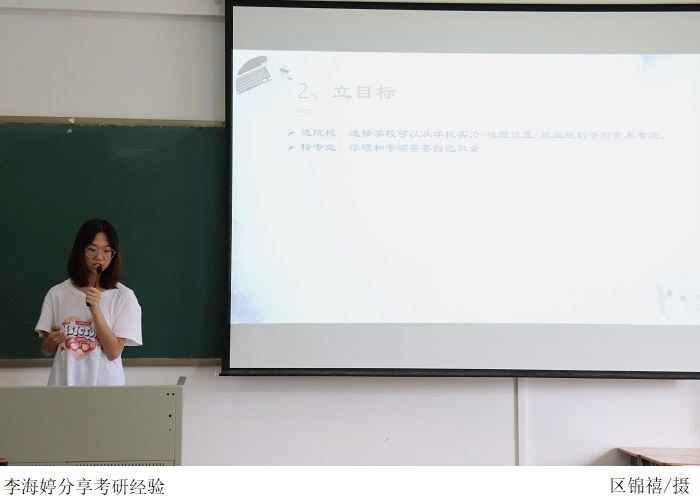 本次学习会邀请了何杉杉(研究生录取院校:广东财经大学)、李海婷(研究生录取院校:广东技术师范大学)、何雨玲(研究生录取院校:安徽师范大学)、李忠能(研究生录取院校:海南师范大学)4位同学分享学习经验。他们就院校和专业目标的选择、考研计划的制定实施、备考的心态调整、具体的复习计划等方面逐一进行分享,建议同学们选择适合自己的专业;找到合适自己的学习方法;备考时要有坚定不移的信心;以及必要时目标要及时调整。分享完毕之后,同学们进行了讨论交流。
