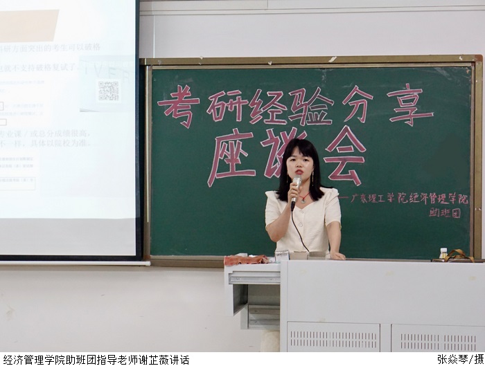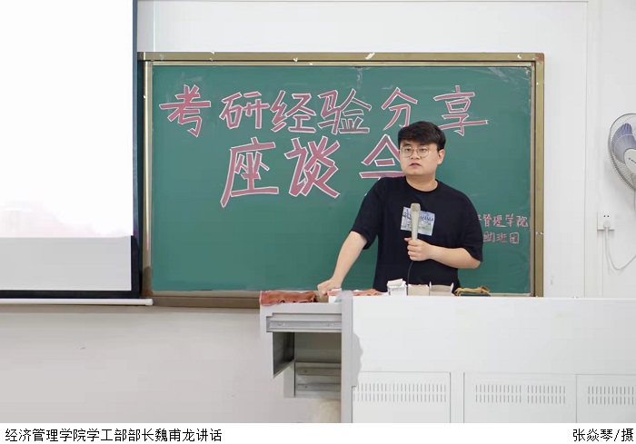 本网讯(经济管理学院 陈锐杰)为加强学院学风建设,更好指导学生考研工作,5月24日晚,经济管理学院在7306教室召开考研经验分享会。活动由蒋林秀老师主讲,经济管理学院学工部部长魏甫龙、助班团指导老师谢芷薇及学院有考研意向的同学参加。