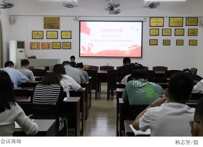 本网讯(信息技术学院 王诗琳)根据学校党委的统一部署和要求,5月10日下午,信息技术学院全体教职工在42203室召开深入学习贯彻习近平总书记在中国人民大学考察时重要讲话精神研讨会。本次学习研讨会采取线上(腾讯会议)与线下相结合的方式开展。