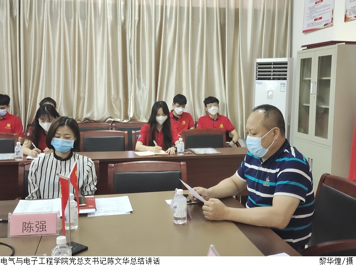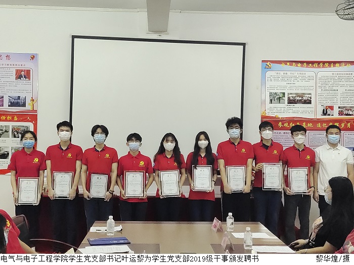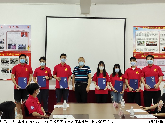 陈强代表党总支宣读《关于成立学生党建工作中心的通知》、《电气与电子工程学院学生党建工作中心部门职责》两个文件陈文华、陈强、叶运黎分别为第一届学生党建工作中心学生干部、学生党支部2019级干事颁发聘书。