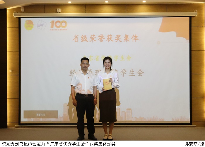 杨洋晨子宣读获奖名单:经济管理学院学生会荣获“广东省优秀学生会”称号,李报荣同学获“广东省优秀学生骨干”称号、王佳乐同学荣获“广东省优秀共青团员”称号。