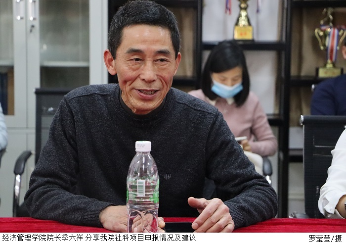 经济管理学院季六祥院长对周副主席的到来表示热烈欢迎。他指出,社科项目的申报是考量科研水平的重要标准是体现学院核心竞争力展示教师学术水平的重要标志学院鼓励教师积极申报项目,认真学习科研学术精神,积极沉淀,不断追求,以更饱满的热情、自信从容的心态投入到科研中去。
