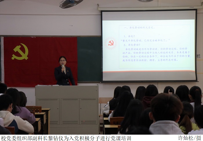本网讯(会计学院 侯斯瑜)为提高学生思想政治觉悟,端正入党动机,会计学院党总支于11月23日下午在42520教室组织开办入党积极分子党课培训班。会计学院学生第一党支部书记郭凤玮主持培训活动,校党委组织部副科长黎钻仪主讲,会计学院2021年第二批入党积极分子参加。