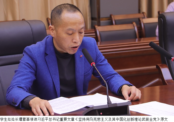 会上,学生处处长谭蒙革领读习近平总书记重要文章《坚持用马克思主义及其中国化创新理论武装全党》原文。谭蒙革表示,对于理论学习,学是过程,用才是根本目的,党员干部要做到知行合一,不断增强工作本领,提高解决实际问题的能力。
