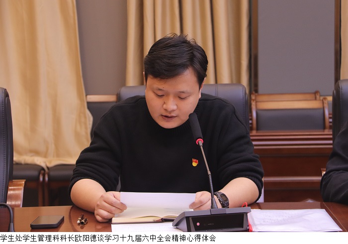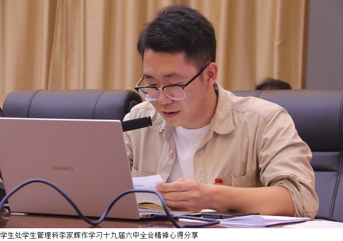 学生处学生管理科李家辉分享学习六中全会精神心得时表示,要在学习六中全会精神中不断强化政治自觉、思想自觉、行动自觉,时刻牢记并践行立德树人使命。