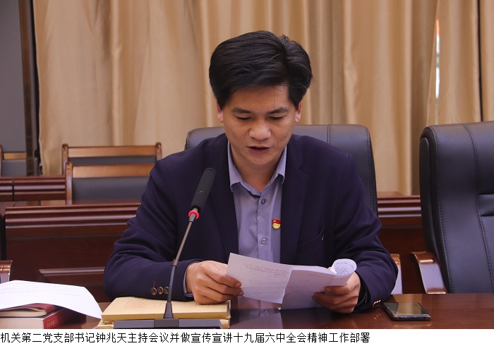 机关第二党支部书记钟兆天作宣传宣讲六中全会精神工作部署。钟兆天强调,党员干部要深刻领会党的十九届六中全会精神的丰富内涵、精神实质,切实把思想和行动统一到党中央的决策部署上来。